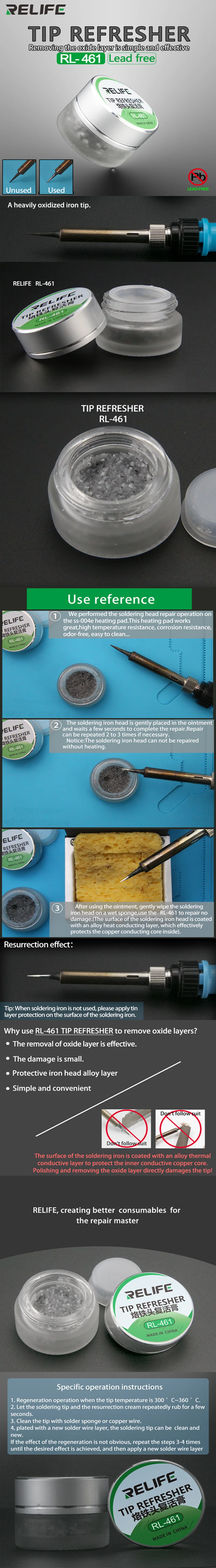 1. Soldering Tip Revitalization: The RELIFE RL-461 Tip Refresher Original is formulated to rejuvenate oxidized or worn soldering iron tips, effectively restoring their functionality and extending their lifespan.
